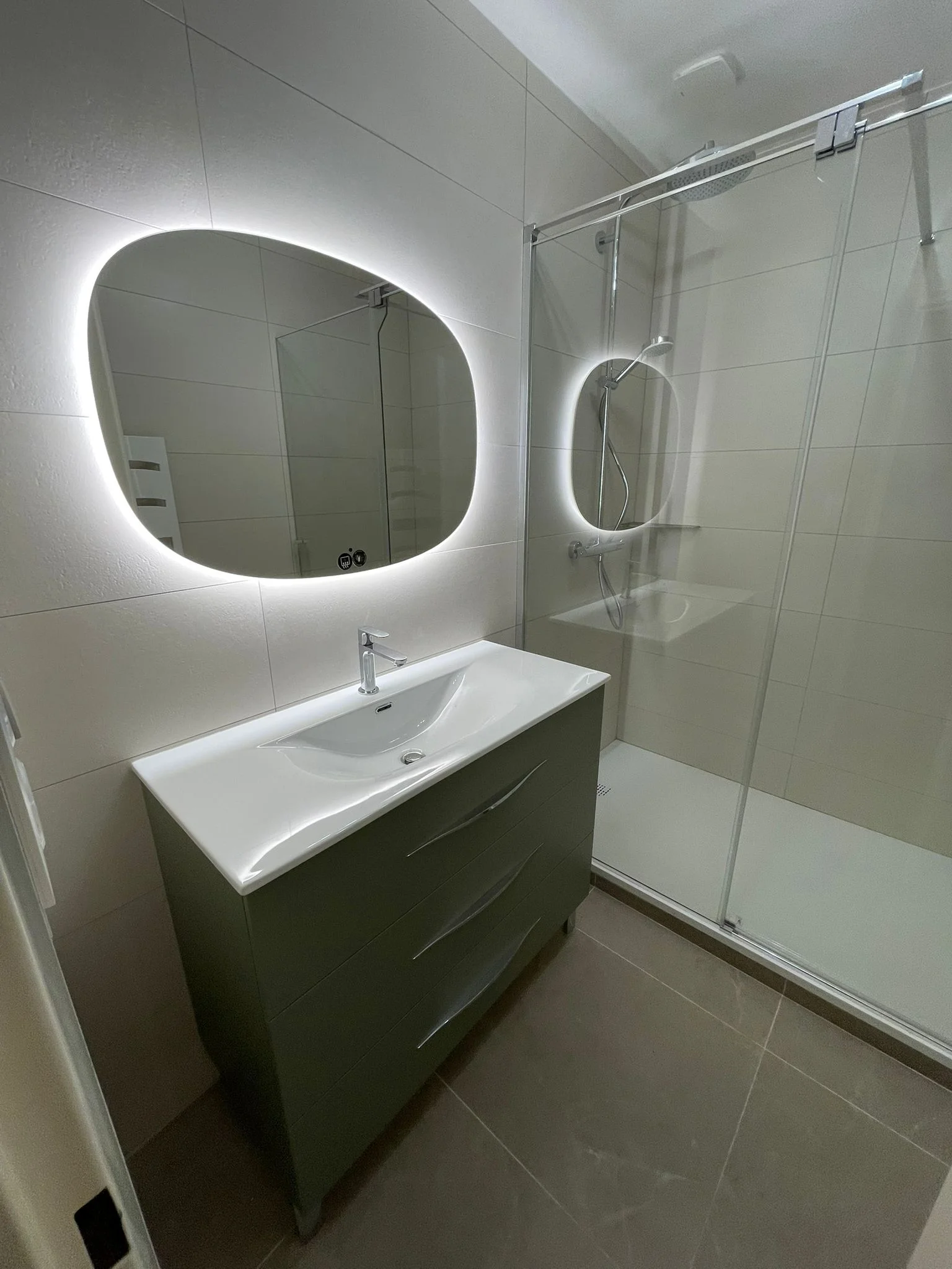 Nous avons procédé à la dépose complète de l’ancien carrelage. Un carrelage grand format 60×60 effet béton gris a été posé au sol afin d’apporter une touche moderne et épurée. Les murs ont été habillés d’un carrelage 30×60 blanc, renforçant la luminosité et la sensation d’espace.